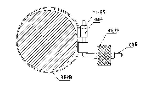 2.按要求的固定距离将不锈钢带和抱箍头一起把水泥杆抱住,用扳手把收紧螺母收紧即可;